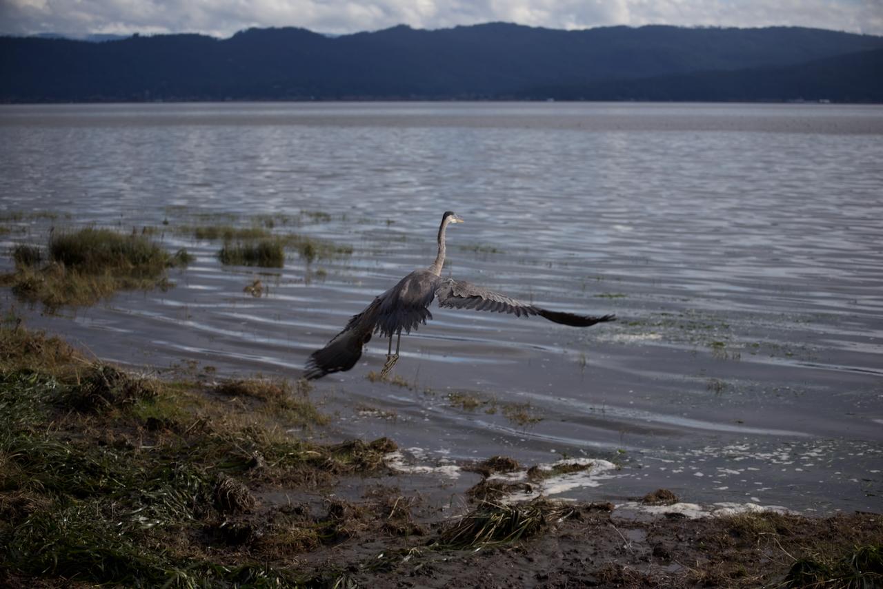 Finally, on the 22nd of December, 19 days in care, flying well, the parasites defeated, body mass restored and red blood cells up from 15 per cent on admission to a very healthy 43 per cent, it was time for release. Due to area flooding, getting back to Table Bluff was iffy, but not for a Heron who can fly. So we took here to the edge of Humboldt Bay, with Table Bluff in view, and she stepped out of our crate and back into her wild and free life!