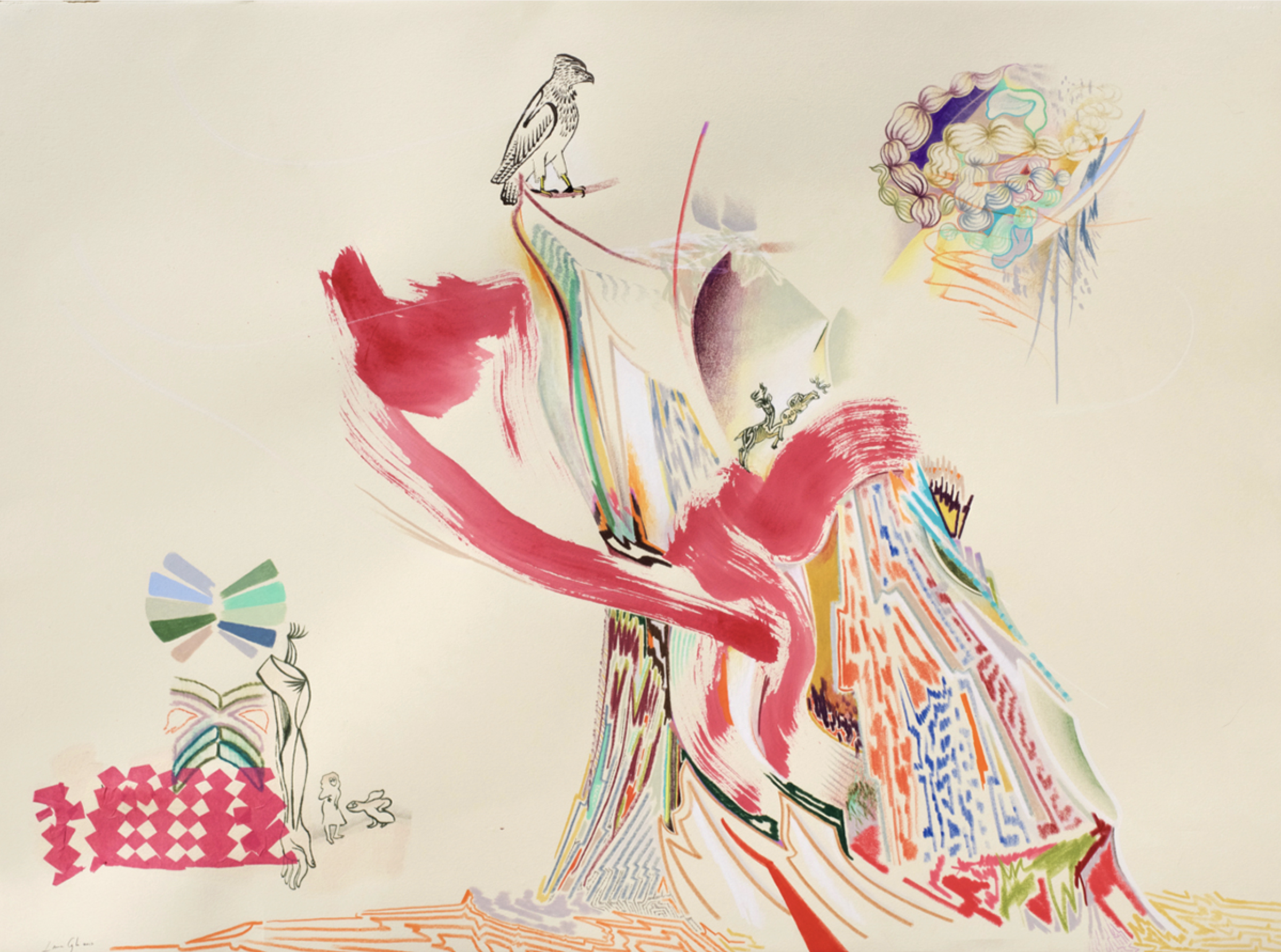 featured image: Nesting Materials: They don’t die 22″ x 30″ ink, pencil, color pencil, china marker, collage on paper 2017, which was lost in the fire.
